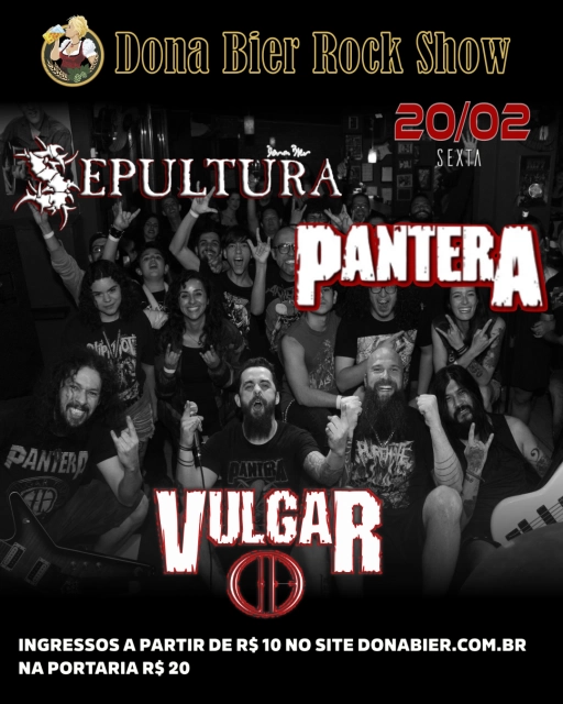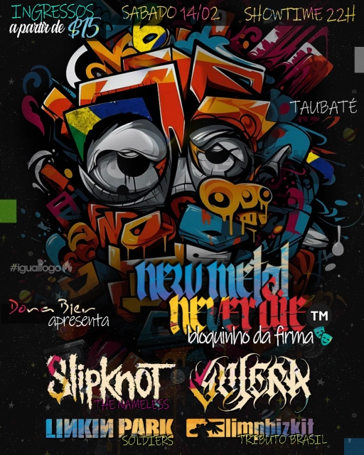 O Carnaval em grande estilo! A parceria entre Dona Bier e New Metal Never Die traz mais um grande evento de carnaval. Junte-se a nós e venha curtir essa noite! No line: Soldiers, estreando no Dona com seu Tributo a Linkin Park LimpBizkit Tributo Br, com a agitação e irreverência que você já conhece The Nameless, que vem do Rio a pedidos da galera com o melhor do Slipknot Sujera, uma das maiores bandas da cena underground do Brasil
